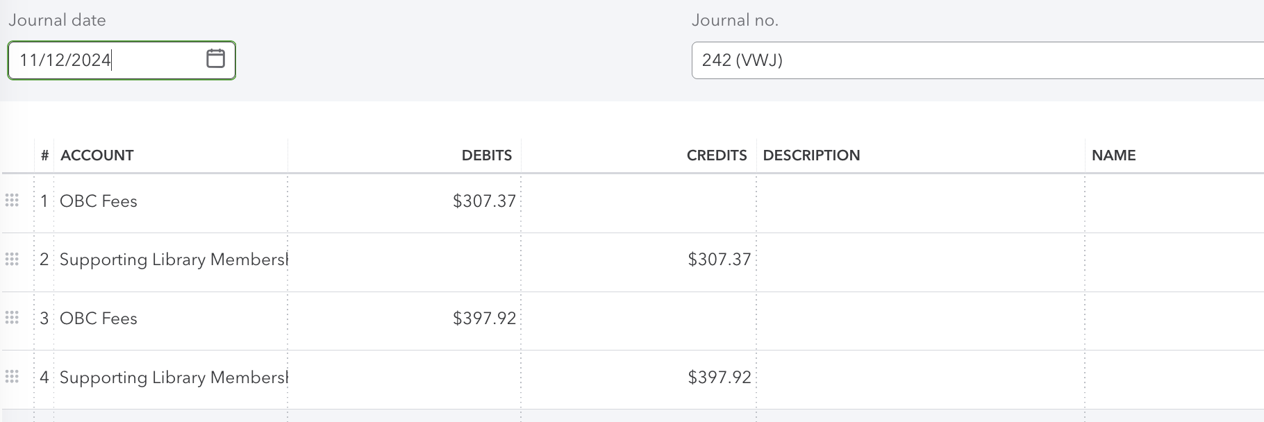 On a monthly basis, the Open Book Collective transfers funds to our account for library subscriptions. These include deducted OBC fees and development fund contributions. These need to be entered into Quickbooks separately as fees. Since the fees are deducted in different currencies, you first need to convert them into USD, using the date of the statement.