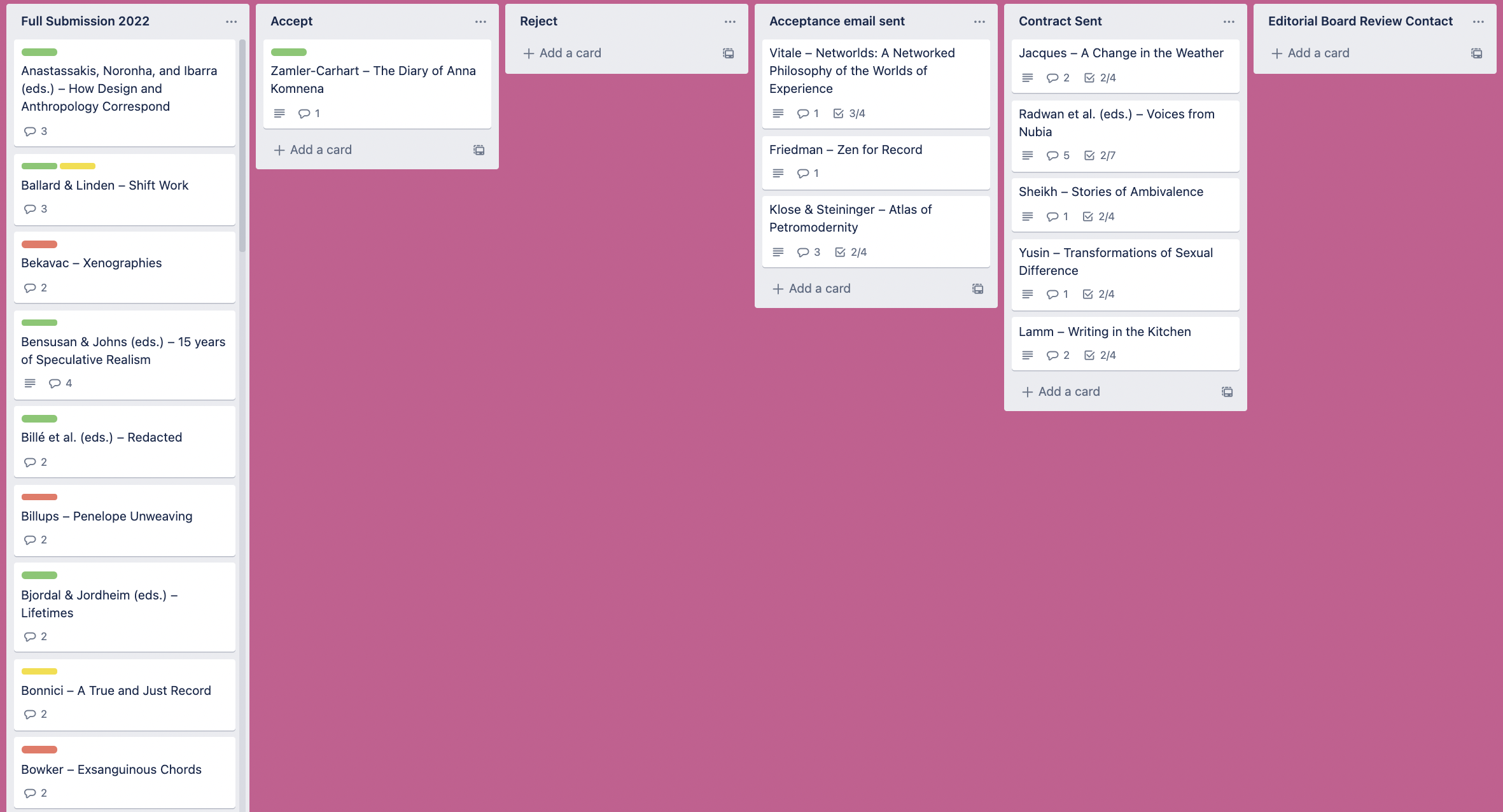 At the same time, a file card is created on the Trello Submissions Board with author name and title of the manuscript, containing contact information of the author(s) and pertinent selections from the email chain. The Trello Submissions board is used to keep track of the status of submitted full mss.